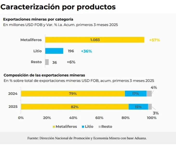Según la Secretaría de Minería de la Nación, las exportaciones mineras representaron el 7,4% del total nacional entre enero y marzo, con un crecimiento interanual del 51,9%. En marzo, las ventas al exterior alcanzaron US$479 millones, un 47% más que en 2024, equivaliendo al 7,9% de las exportaciones totales del país.